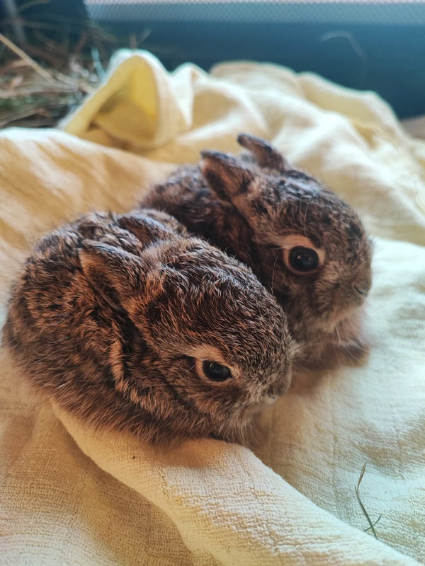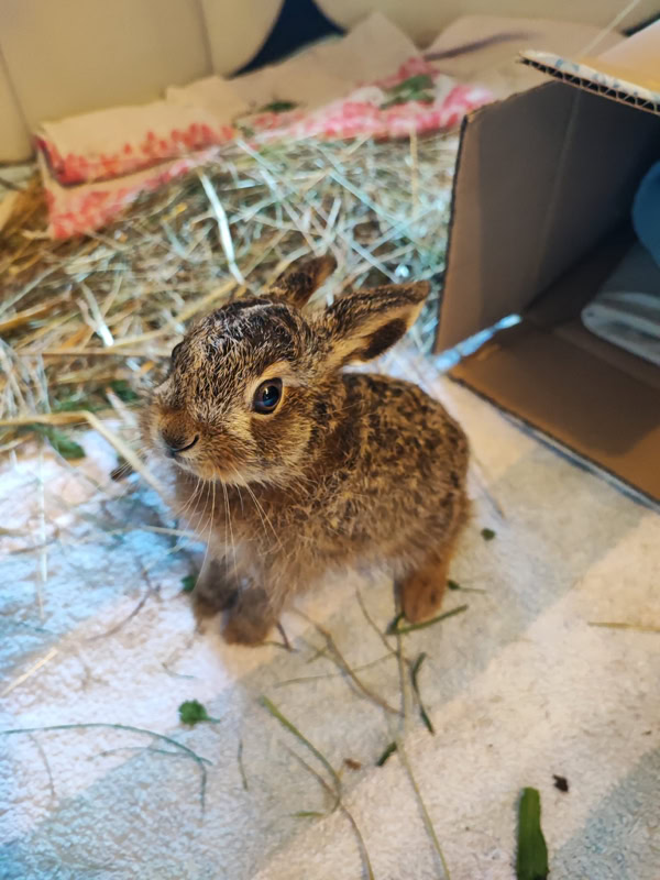 “Ich bin ein Hasenkind! Meine Mama hat mich schön versteckt abgelegt und hat gesagt, ich soll warten. Das ist langweilig, aber ich werde nicht gefressen, wenn ich still halte. Außerdem rieche ich noch nicht nach Hase! Das ist sehr wichtig, damit eure Hunde mich nicht finden. Meine Mama kommt erst in der Dämmerung wieder und ich darf schöne warme, fettige Milch trinken. Das hält lange vor. Meine Mama erzieht mich auch nicht, ich kann schon alles alleine, ich muss bloß wachsen! Bitte lasst mich sitzen! Nur wenn ich ganz nass, verletzt bin oder auf der Seite liege, dann nehmt mich bitte mit und helft mir!“
